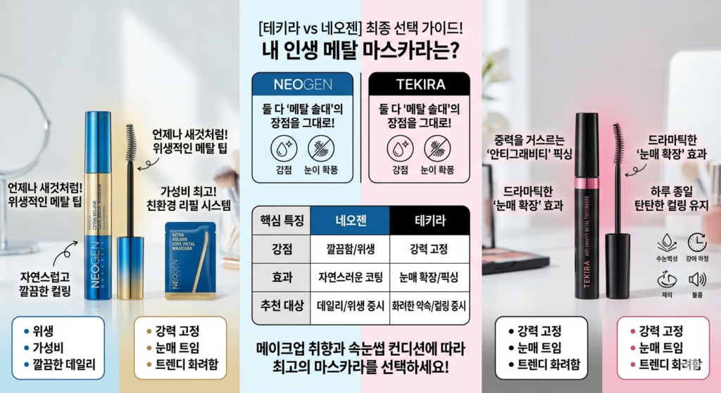 일반적인 브러시 타입이 아닌 ‘메탈(금속)’ 솔대를 사용해 위생적이고 뭉침 없이 발리는 장점 덕분에 메탈 마스카라를 찾는 분들이 정말 많아졌는데요. 그중에서도 올리브영 1위에 빛나는 원조 맛집 ‘네오젠 메탈 마스카라’와 최근 연이은 품절 대란을 일으키고 있는 ‘테키라 메탈트임카라’를 꼼꼼히 비교해 보겠습니다. 어떤 제품이 내 눈매에 딱 맞을지 지금부터 확인해 보세요!